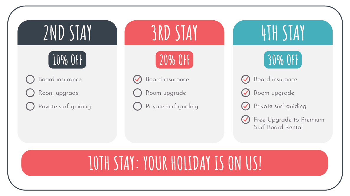 Wenn vertraute Gesichter zurückkehren, ist es das, was unsere Gemeinschaft lebendig macht. Um unsere wiederkehrenden Gäste zu ehren, haben wir unser Treueprogramm ins Leben gerufen, um uns dafür zu bedanken, dass ihr euch entschieden habt, Teil unserer Surfcamp-Familie zu sein. Jedes Mal, wenn du bei uns bleibst, erhältst du einen Rabatt auf deinen Zimmerpreis und einige zusätzliche Vorteile, die deinen Aufenthalt noch angenehmer machen!